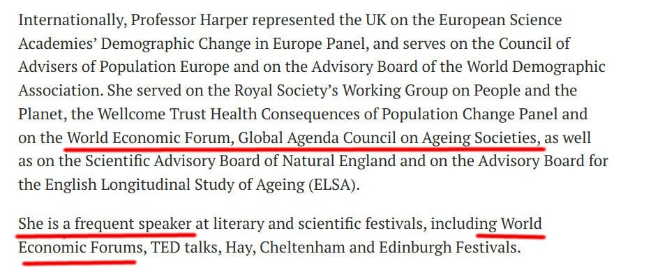 Η καθηγήτρια της Οξφόρδης Σάρα Χάρπερ είναι ένα πολύ σημαντικό πρόσωπο. Το άρθρο της Telegraph που απαριθμούσε τα διαπιστευτήριά της ξέχασε να αναφέρει ότι συμμετέχει στο Παγκόσμιο Συμβούλιο Ατζέντας για τις Γηράσκουσες Κοινωνίες του Παγκόσμιου Οικονομικού Φόρουμ.